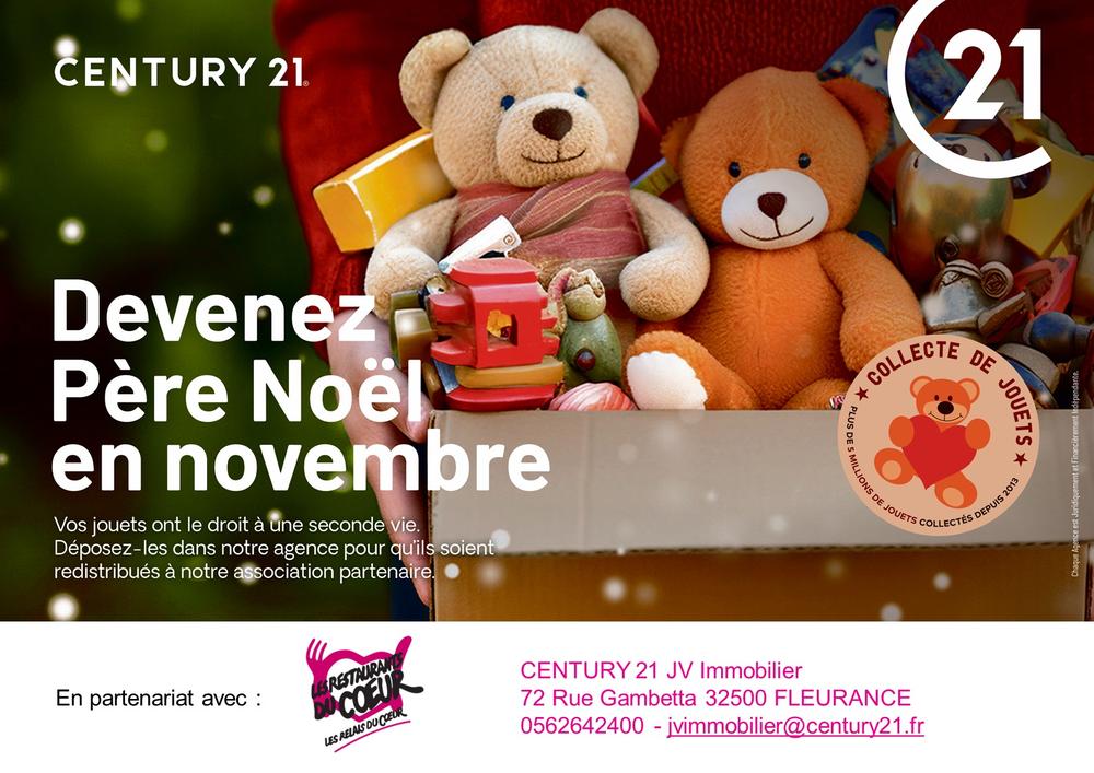Et bien sûr durant tout le mois de Novembre, les agences Century 21 JV Immobilier de Fleurance et Condom vous invitent à participer à la traditionnelle Collecte de Jouets au profit des Restos du Cœur ! A l’approche de Noël, Rendez-Vous dans nos agences pour déposer des jeux et jouets pour les enfants.
