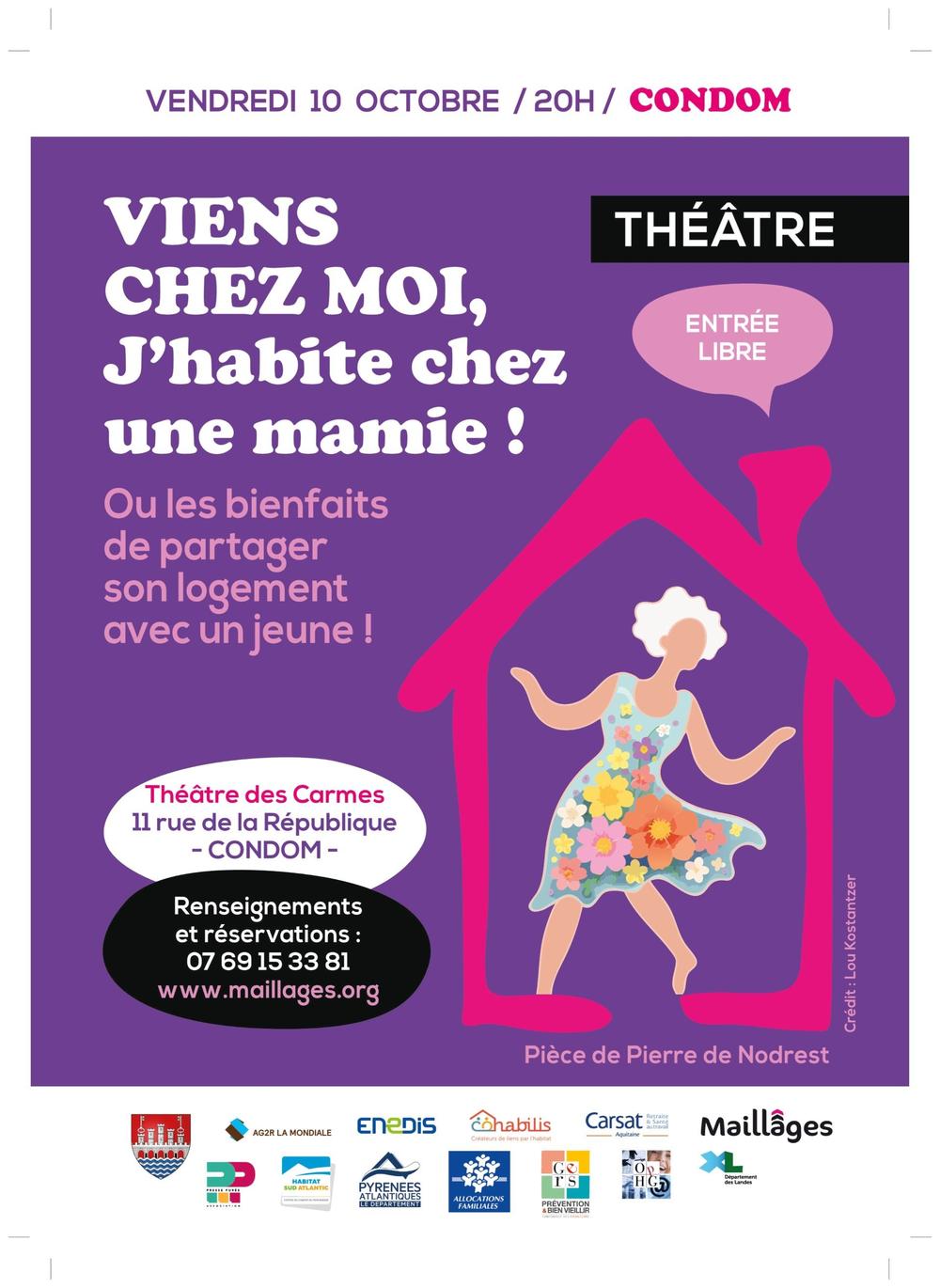 Dans le cadre de la semaine du Bien Vivre Ensemble qui se déroule du 5 au 12 octobre, l'association "Maillâges" présentera le vendredi 10 octobre à 20h au théâtre des Carmes la pièce "Viens chez moi, j'habite chez une mamie".