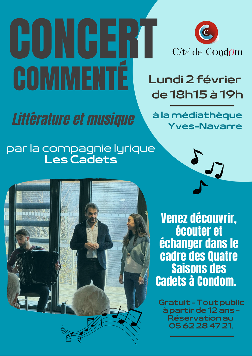 Venez assister au concert commenté de la compagnie lyrique des Cadets à la médiathèque à 18h15.